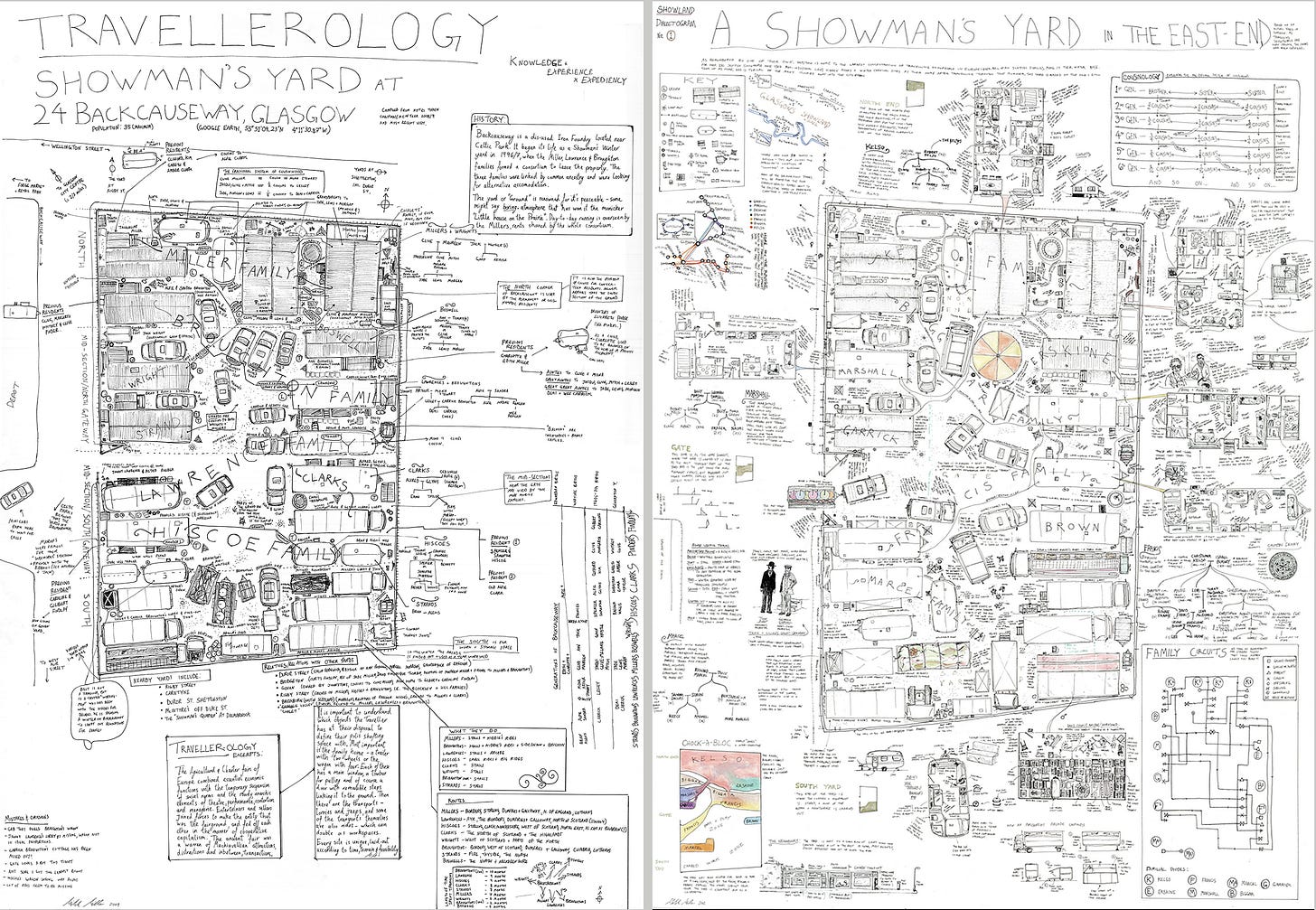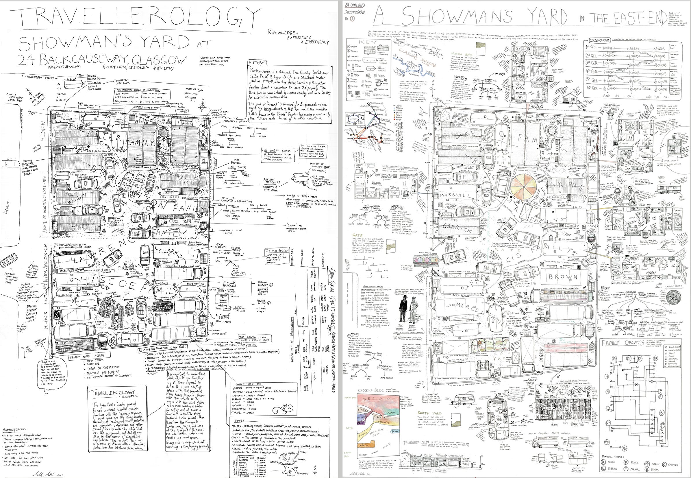 And that is where the dialectogram came in, late in 2009, a vernacular, demotic counterpoint to the authoritative diction of planners’ maps, anthropological schematics, architectural floor plans and other mosaics. A satire of official drawings and the agenda they push. I began the first one by drawing the place where I came from as if I was seeing it from above – the Showman’s Yard where my own parents, siblings and relatives lived. It showed not a here today, gone tomorrow ‘encampment’ (the loaded word local politicos deliberately used to describe them) but what it was – a place that had been there for 11 years, that had its own order, values and culture. My drawing ‘borrowed’ the bird’s-eye view to make a point about what existed in the white spaces of the east end masterplan – the scratchy marks that would never be included in a map of the new Dalmarnock.
