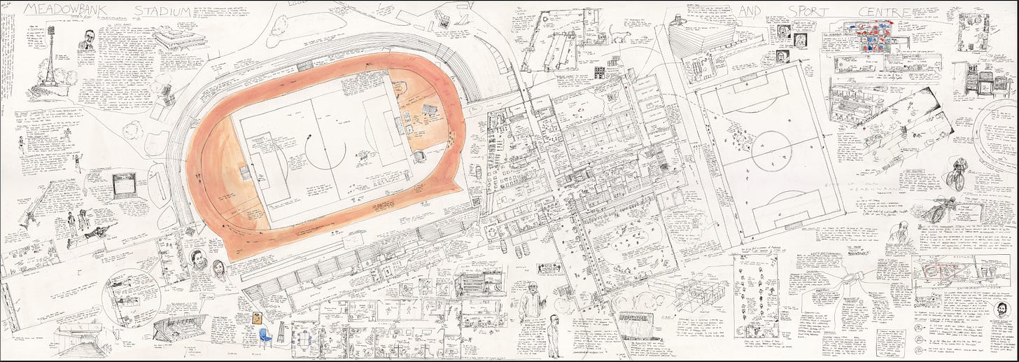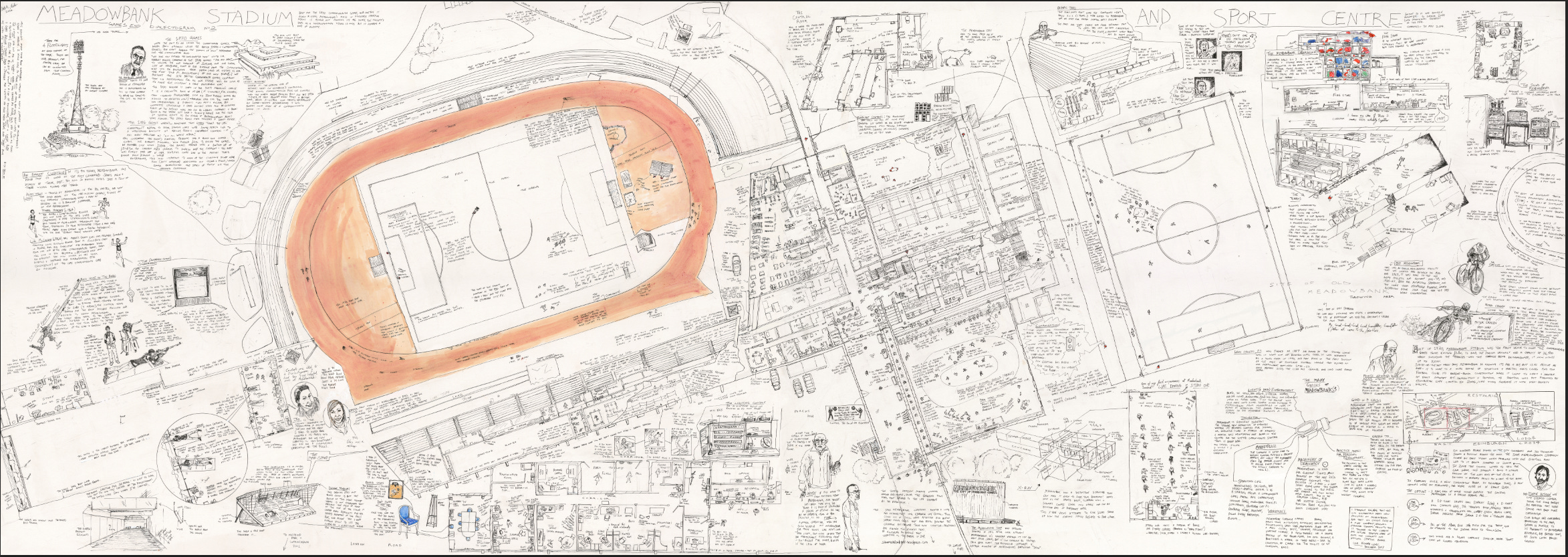 The images that result from this, whether it’s the series of five I made at the iconic Red Road Flats in Glasgow, the Piershill Community Health Flat, the Claypits Nature Reserve, Clydebank Library or the Barrowland Ballroom reflect what you might call the pigeon’s-eye view. We might see Meadowbank Stadium (home to the 1970 and 1986 Commonwealth Games in Scotland) from above, but the majority of what it shows you is based on knowledge of what is happening in its corridors, halls and pitches. Like the women of Piershill Square West, less than a mile away, who kept their eye on their community from the flat on the corner, the pigeon-eyed dialectogram gets to know its turf intimately – who is who, what is what, where it all happens – while keeping in mind how it all fits together.