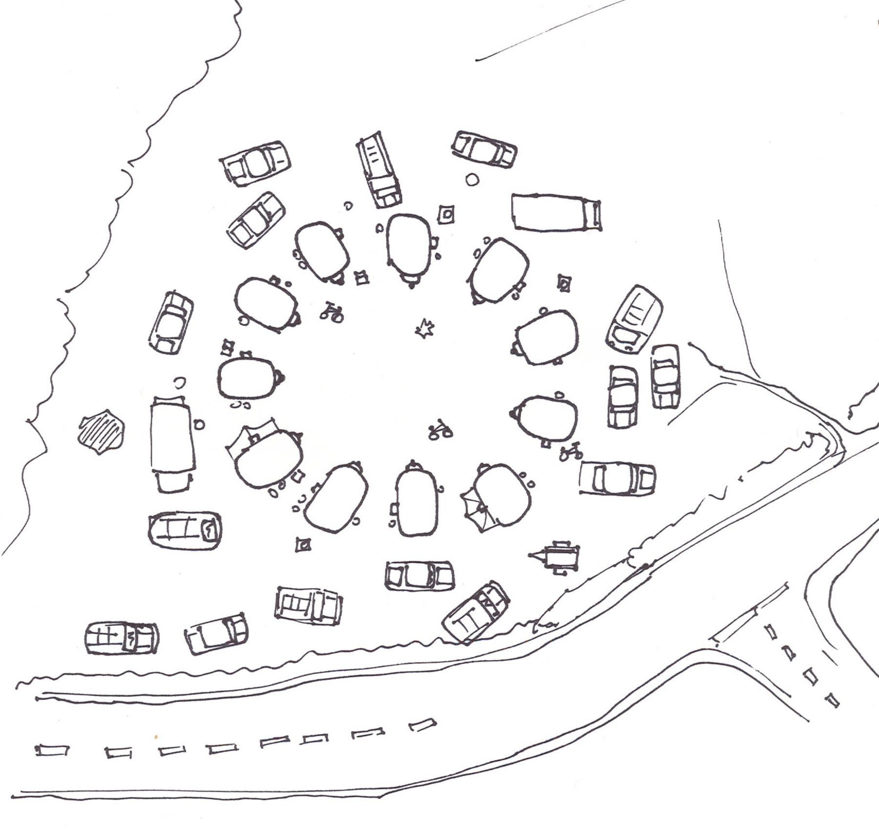 When Gypsies choose the layout, they often place the trailers in a circle, with a single entrance. The main windows, usually the towing bar end, face inwards. Every trailer and its occupants can be seen by everyone else.